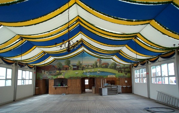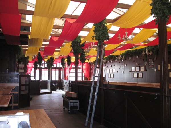 Dieses Foto zeigt die Himmeldekoration in einem kleineren Festzelt auf der Wiesn. In diesem Zelt dekoriere und nähe ich seit 2007. |