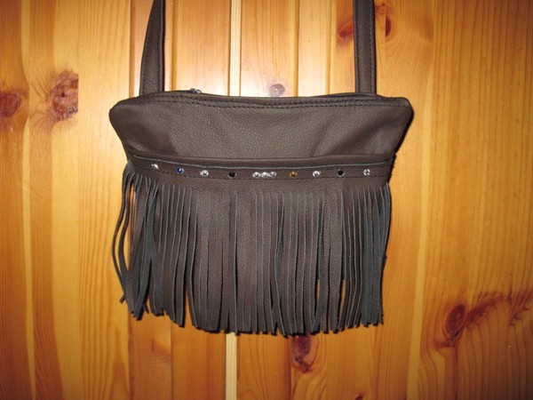 Die flotte Tasche ist aus braunem Leder gefertigt und hat dekorative Fransen und Nieten. Sie ist innen gefüttert und hat ein Reißverschlußfach. Sie wird mit einem Reißverschluß geschlossen, andere Verschlußarten sind aber frei wählbar. Ebenso die Farbe des Leders und des Innenfutters. |