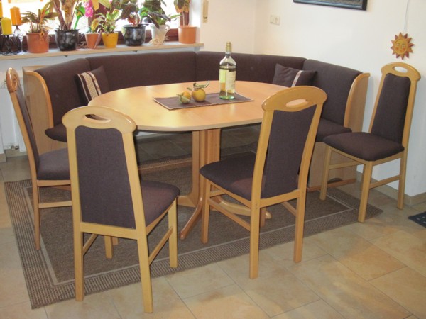 Die Eckbank wurde rundum erneuert. Das heißt, sie bekam neue Schaumstoffe und Bezüge, ebenso die Stühle. Dazu passend der Tischläufer und die Zierkissen. |